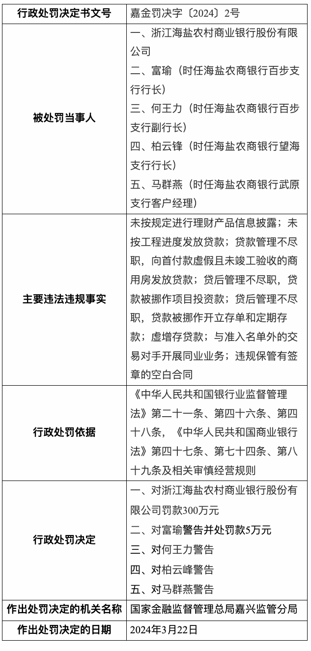 4月1日,国家金融监督管理总局嘉兴监管分局行政处罚信息公开表显示,2024年3月22日,浙江海盐农村商业银行股份有限公司被处罚款300万元,时任海盐农商银行百步支行行长富瑜被警告并处罚款5万元,时任海盐农商银行百步支行副行长何王力、时任海盐农商银行望海支行行长柏云峰、时任海盐农商银行武原支行客户经理马群燕,均受到警告处罚。主要违法违规事实为:未按规定进行理财产品信息披露;未按工程进度发放贷款;贷款管理不尽职,向首付款虚假且未竣工验收的商用房发放贷款;贷后管理不尽职,贷款被挪作项目投资款;贷后管理不尽职,贷款被挪作开立存单和定期存款;虚增存贷款;与准入名单外的交易对手开展同业业务;违规保管有签章的空白合同。