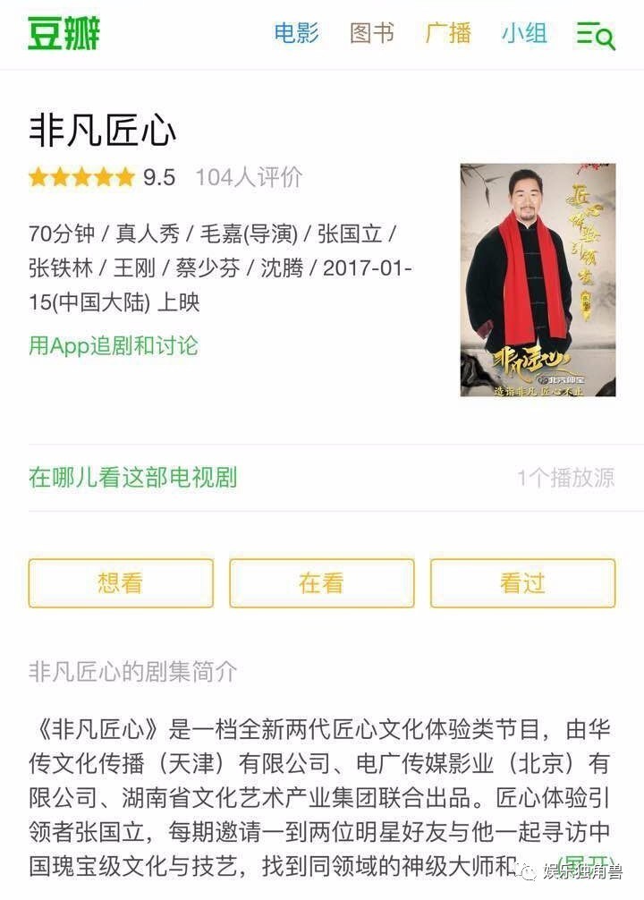 但是,仍有这样一群人选择以电视综艺为节目载体,用镜头语言表达对文化的传承、对匠人精神的执着。继成功打造文化类节目《传承者》之后,北京卫视再度聚焦传统文化,携手华传文化传播(天津)有限公司、电广传媒影业(北京)有限公司、湖南省文化艺术产业集团,推出两代匠心文化体验节目《非凡匠心》,于1月15日晚在北京卫视、优酷平台播出,目前已播出三期,节目在豆瓣的评分竟高达9.5,达到国内综艺的最高峰。