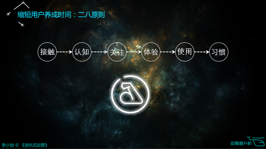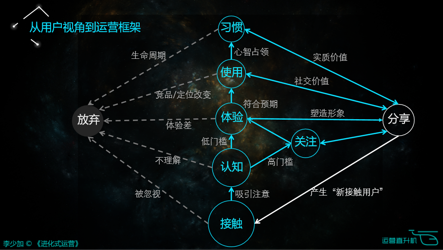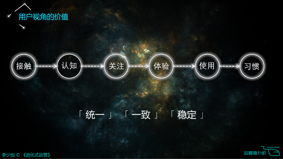 首先运营不是简单一下就把潜在用户变成一个习惯用户的过程。恰恰相反,运营是循序渐进、环环相扣而使潜在用户转化成习惯用户的一个漫长过程,而且这个过程当中,这些用户还会不断的影响他生活轨迹中的其他用户。这一系列的认知非常重要,从用户视角来看,所有人从接触、认知、关注、体验、习惯,所有的过程都是一致的、统一的、稳定的。