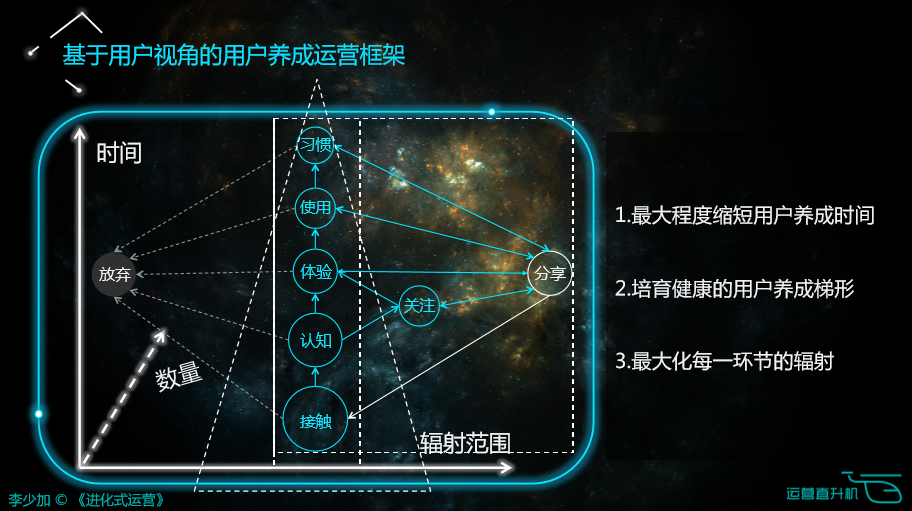 以时间作为纵向坐标轴,以辐射的范围作为横向坐标轴,以数量作为水平坐标轴,套上一个框架。这个框架就是用户养成运营框架,由此可以推出运营工作的实质,也是做任何运营的一个策略动机和出发点。