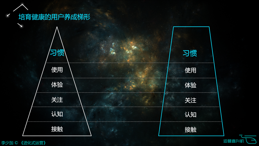 第二,培育健康的用户养成梯形。当一批接触用户变成习惯用户,它的人数慢慢变少就形成了这样的梯形。