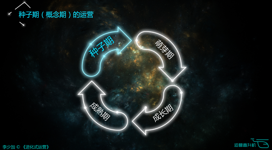 通常业界是按照四大生命周期作为一个标准,但是这里提的四个生命周期首先种子期是概念期,就是产品没有形态的时候叫种子期。很多产品在诞生的时候都有一个不成形的,就是一个解决方案的阶段。