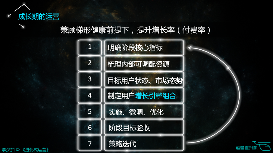 成长期的运营,首先确保这个用户养成梯形健康,如果不健康就不能进入下一步。确保健康的前提之下才要考虑其它的来拉动用户增长。这个时候依然考虑到底拉动用户总数还是拉动付费用户总数,这是两个不一样的情况。