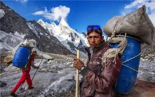 在巴尔托洛冰川休息的背夫。现在已经铺设了翻越Gondogoro La 的路绳,之前,所有前往K2 大本营徒步的徒步者都需要原路返回。