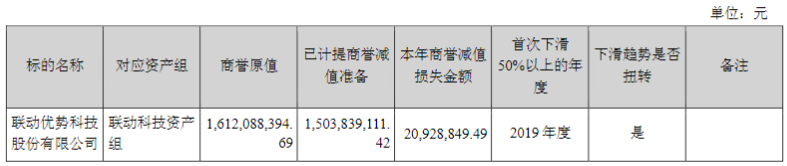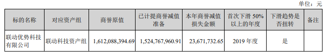 2019年,海联金汇巨亏24.56亿元,也是其自2011年上市以来首次亏损。报告期内,公司联动科技、联动商务资产组合计商誉减值损失金额20.69亿元,占联动优势商誉账面原值83%。另外,联动优势本报告期实现营收、净利润分别为9.55亿元、-4.06亿元,而2018年营收、净利润分别为11.2亿元、2.38亿元;实现毛利率33.84%,同比下降19.97%。