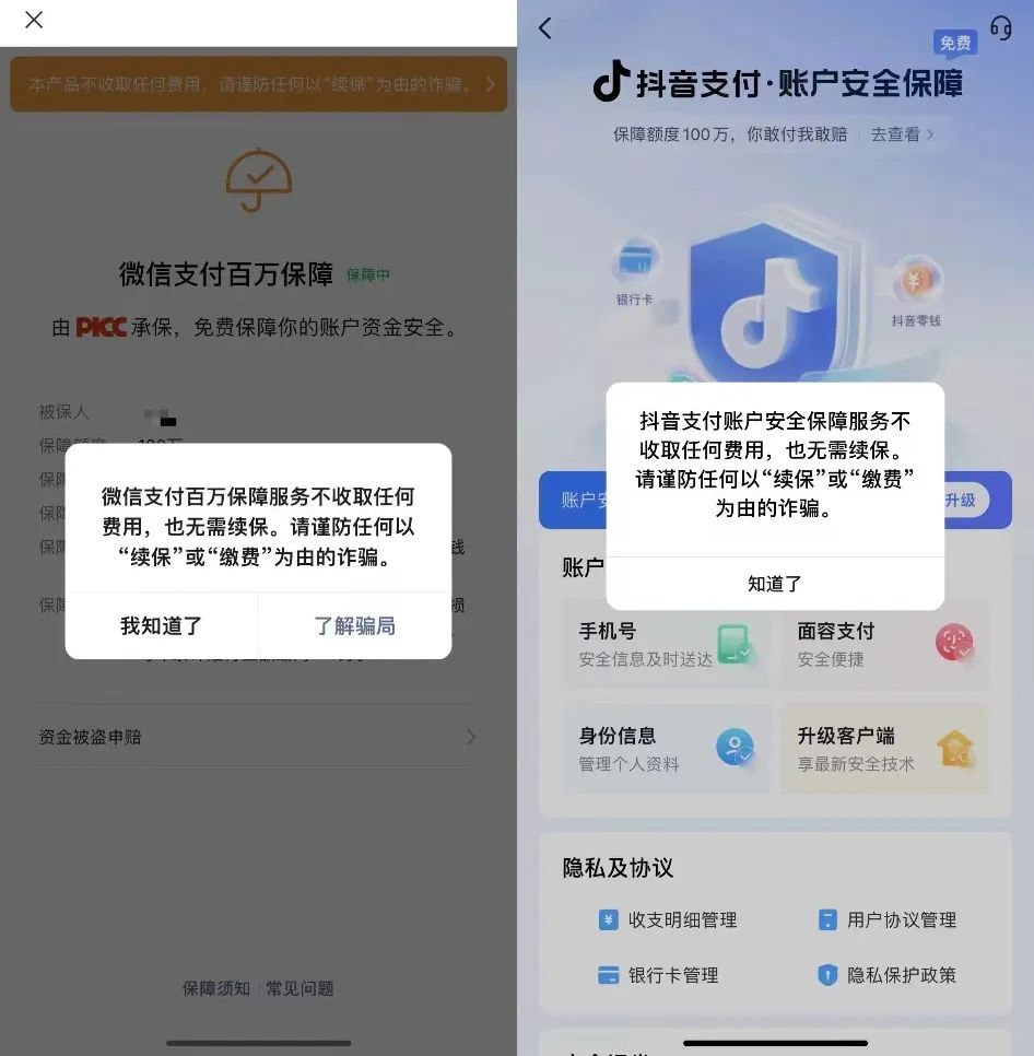 目前,由于类似骗局太多,这些支付工具大多在页面上主动跳出“谨防任何以‘续保’和‘缴费’为由的诈骗”,但从笔者体验来看,这些提示大多隐藏较深,比如抖音的“安全保障”防诈提醒,要在消费者点击抖音钱包首页的“安全保障”之后才会出现;微信支付防诈提醒则要进入“资金安全保障中”,再点下一步才会出现。用户并不能第一时间在首页看到,大大降低了“诈骗提醒”的有效性。