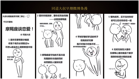 我们最早期的时候以摩羯座为话题,因为摩羯座有明显的特征。比如喜欢一个人就是不说,这是摩羯座大家提到的,还有就是工作狂,我们每天都可以做这样的内容。当时大家黑处女座,从有了同道大叔之后我们每个星座都黑,这是我们做星座内容的时候做的一些事情。