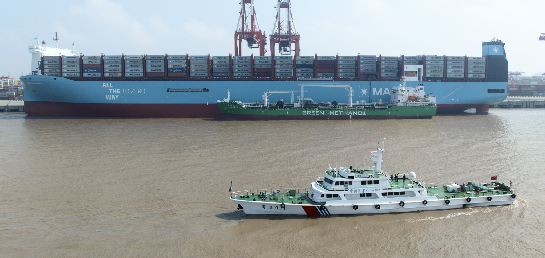 4月10日上午,在上海海事局远程安全监控和海巡艇现场护航下,国内首艘营运的甲醇燃料加注船“海港致远”轮为靠泊在洋山深水港冠东码头的大型甲醇动力集装箱船舶“阿斯特丽德马士基”(Astrid Maersk)轮成功加注504吨绿色甲醇,而且实现了集装箱装卸和甲醇燃料加注同时进行。