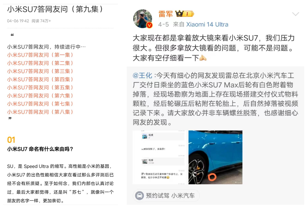 营销策略上,里子对标标杆产品Model 3、面子对标保时捷、CEO对标马斯克给车主开门······目前持续进行中的,是小米SU7答网友问系列。