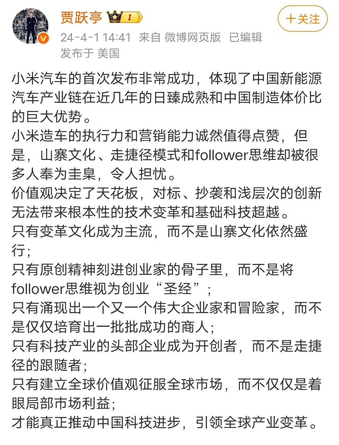 耗资百亿造车遗憾离场的贾跃亭,是懂得先扬后抑的。他想说的无非是,雷军是那个走捷径的跟随者而非开创者;