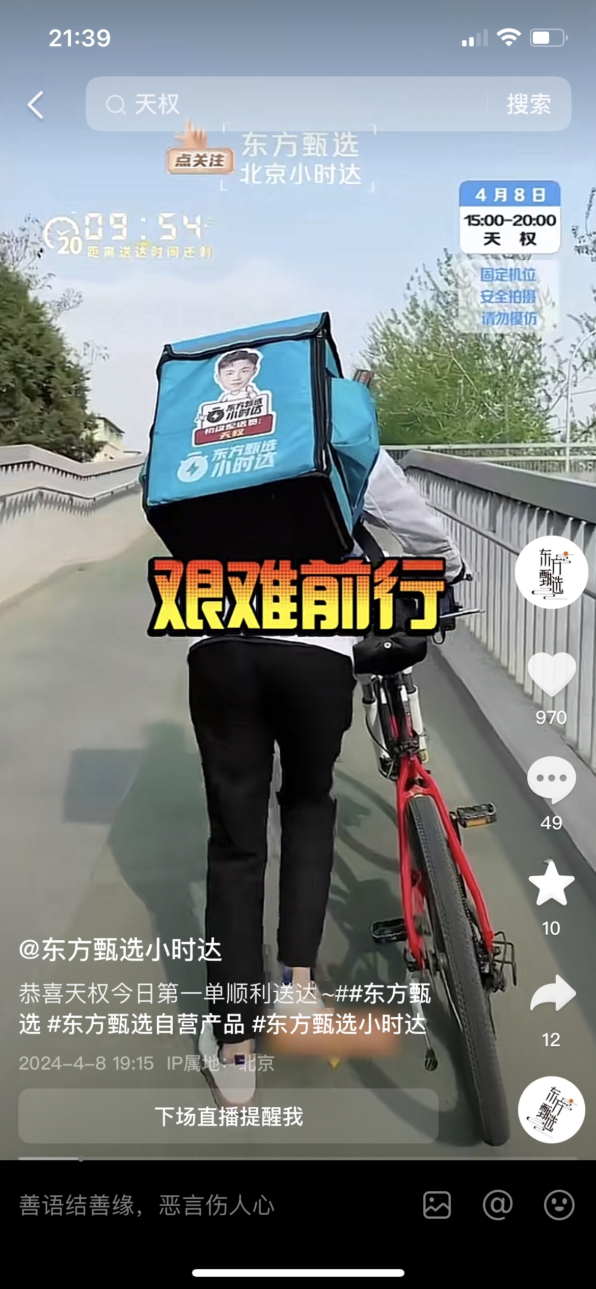 4月8日,东方甄选宣布在北京启动“小时达”业务,还开启了直播送货。4月8日-11日,天权、冯冯、思宇、敬文4名主播随机选派直播间的部分订单。