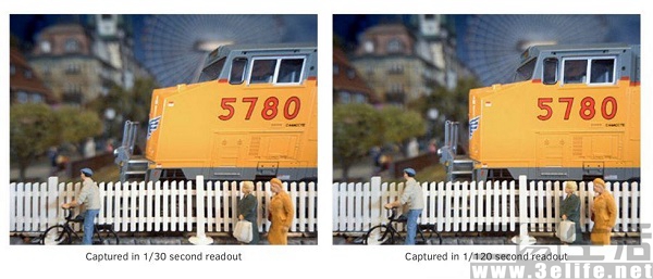 我们一起来看看三层CMOS的读出速度究竟有多快,对于一张1930万像素的照片来说,IMX318作为传统堆栈式CMOS,从像素区域传输到ISP中进行数据处理需要1/30s,这种速度会造成轻微的失真,类似于视频拍摄中的果冻效应,而三层CMOS的这一过程仅需要1/120s,速度是IMX318的四倍,两者失真的比较下图很明显。