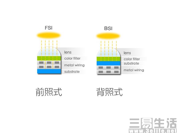 为了解决这个问题,自然而然地想法就是去掉像素区域上方的金属排线遮挡,”背照式“CMOS随之而来,其实使用的是一个非常直接的思路:将金属排线从像素区域上方移到了下方,失去了遮挡的像素区域自然像脱了缰的野马,成像实力大大提升。