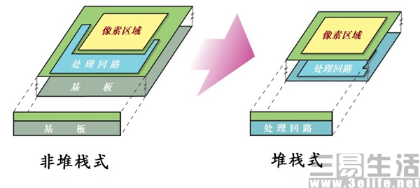 那么如果还想提升成像,还能怎么办呢?索尼又想到一句至理名言:“底大一级压死人”,现在相同面积的基板上,“背照式”CMOS的像素区域仅占整个传感器一部分的面积,其他一部分都是“处理回路”,也就是管理像素区域的部分。如果能够把整个CMOS的面积都利用成为“像素区域”,那么成像就能进一步提升。所以“背照式”就应运而生了,索尼将“处理回路”部分移到了像素区域下方,用电路板取代了之前的支撑衬底,由此换来了更大的感光面积,带来了更好的画质。