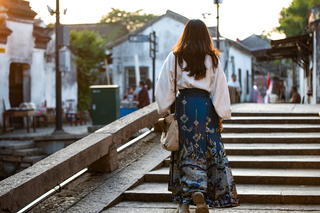 徐鲁青:我发现江南古镇穿汉服拍照的人真的很多,之前去乌镇、苏州、扬州都会看到。可能是因为这些古镇的背景板是传统的中式风格建筑,所以穿汉服比较适应。但是我觉得在大学路上穿汉服的人会和周边建筑有很明显的对比:一边是星巴克、阿拉比卡咖啡这种很现代的东西,一边又是古典的汉服穿着。