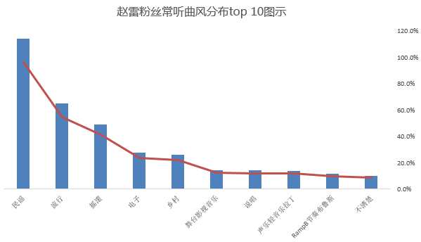 根据网易云音乐的数据,赵雷粉丝们最常听的歌曲风格排行中,排第一的即为民谣,比例高达96%,其次为流行、摇滚、电子、乡村等。一入民谣深似海,不得不说,赵雷粉的民谣属性,还是非常重的。