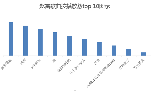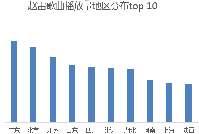 而在按赵雷歌曲播放总量的地区排行榜中,位居第一的则为广东,排二、三、四位的分别北京、江苏、山东,四川依然排第五位。广东为中国互联网第一大省,历来是互联网用户量最大之地,所以赵雷歌曲播放总量第一省为广东,也不难理解。
