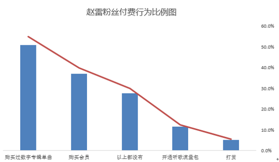 都说民谣穷,听民谣的人也穷,然而在赵雷粉丝付费行为的数据中,购买过数字专辑或单曲的比例高达55%,远高于普通音乐用户的音乐付费比例,购买过会员的比例也高达40%。