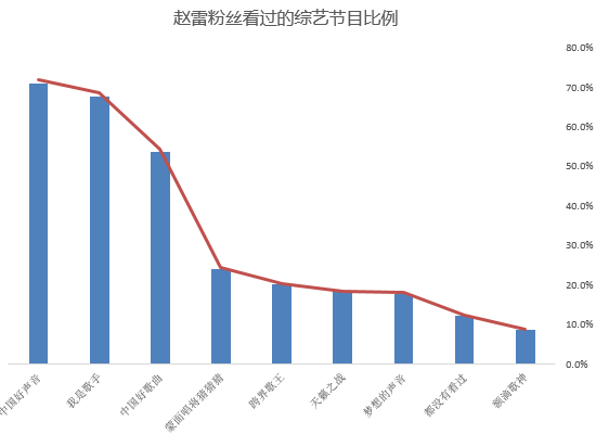 而赵雷粉丝看得最多的音乐综艺为《中国好声音》,其次为《我是歌手》,再次就是《中国好歌曲》。
