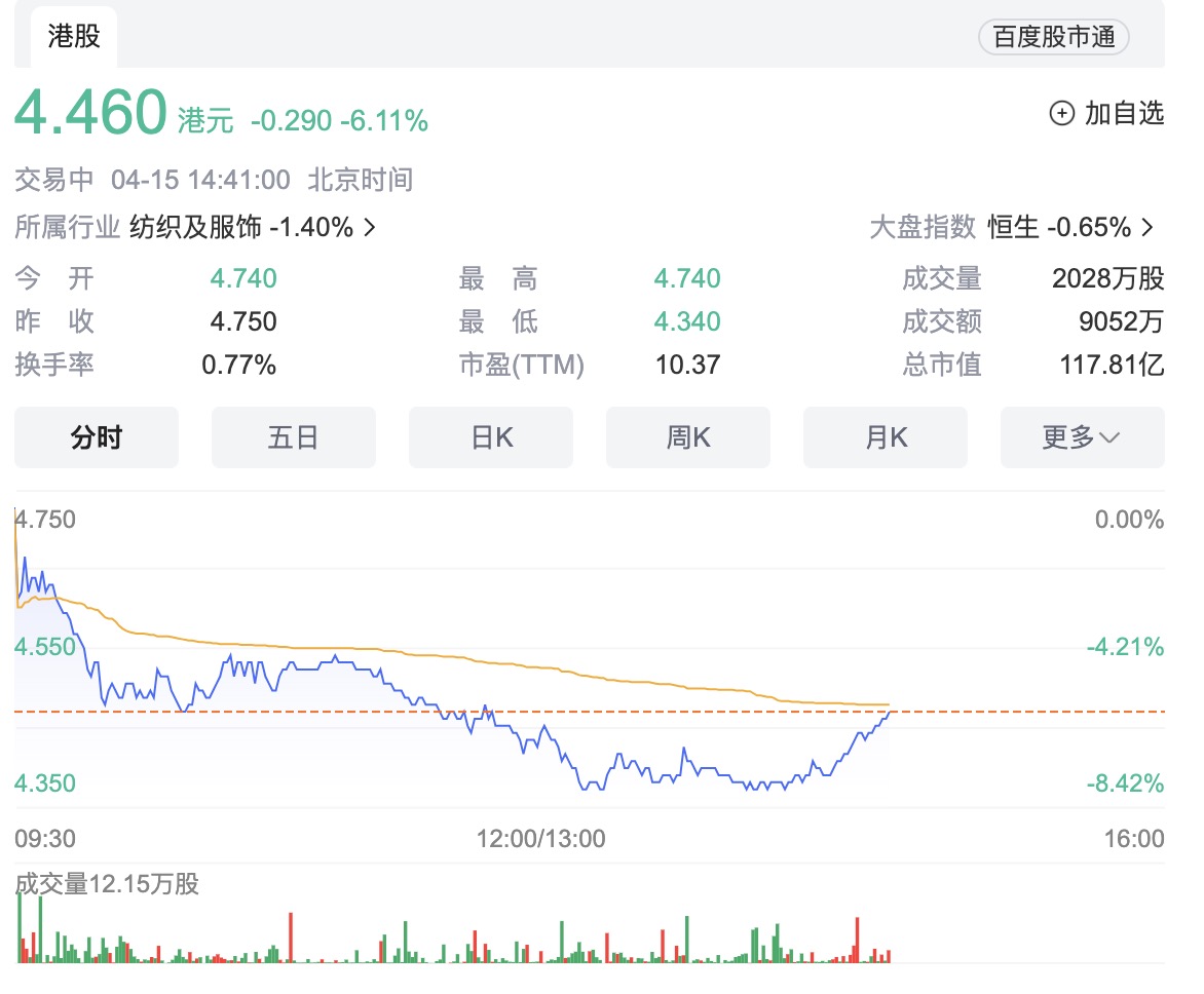截至发稿,港股特步国际股价下跌近6%,报价4.460港元。