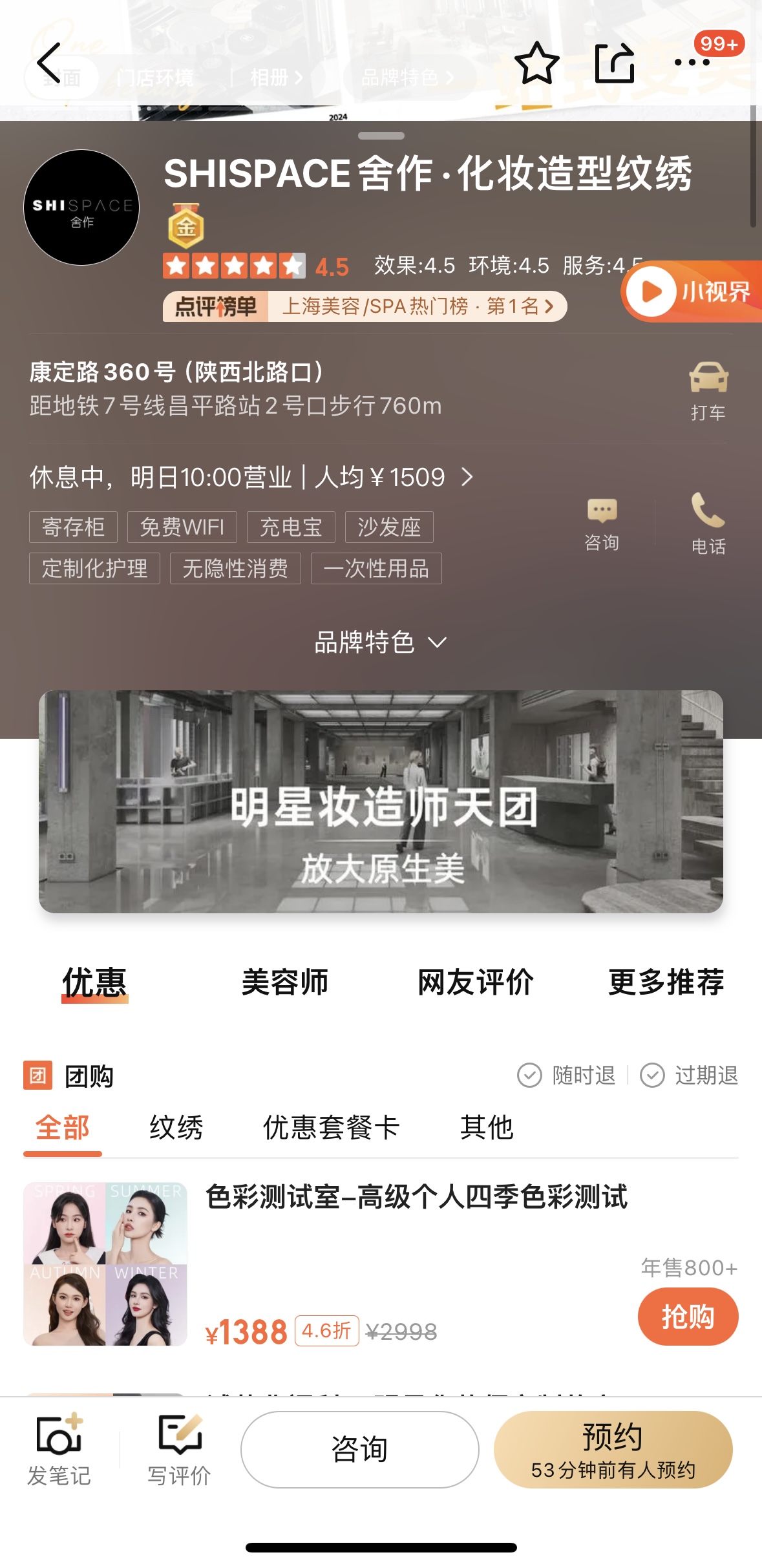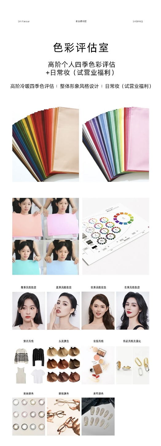 实际上,标价1388元团购价的色彩测试室已经是SHISPACE舍作较为便宜的套餐,包含一次服务市场2小时的个人四季色彩评估以及日常妆。大众点评套餐中目前还有售价7880元的网感野生眉,即修饰眉形的服务。