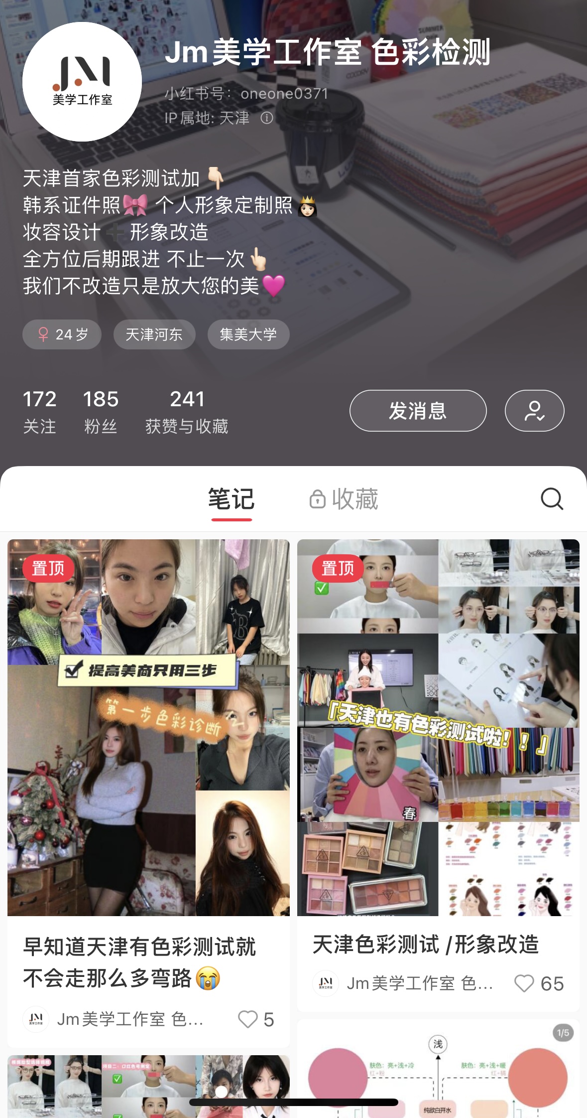 2023年中,花花看到抖音上韩国色彩测试视频爆火后,决心以此创业。在深圳学习考证后,2024年3月,花花在天津开了首家名为“JM美学工作室“的色彩测试店。