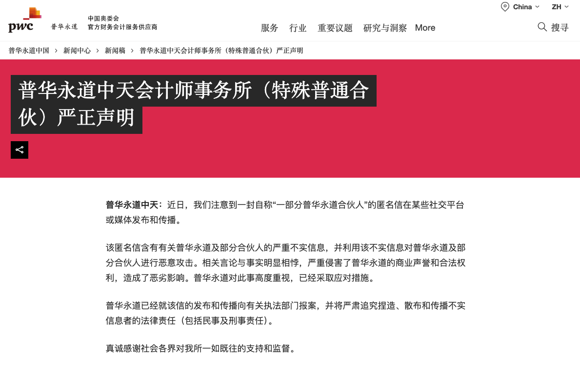 普华永道表示,相关言论与事实明显相悖,严重侵害了普华永道的商业声誉和合法权利,造成了恶劣影响。普华永道对此事高度重视,已经采取应对措施。普华永道已经就该信的发布和传播向有关执法部门报案,并将严肃追究捏造、散布和传播不实信息者的法律责任。