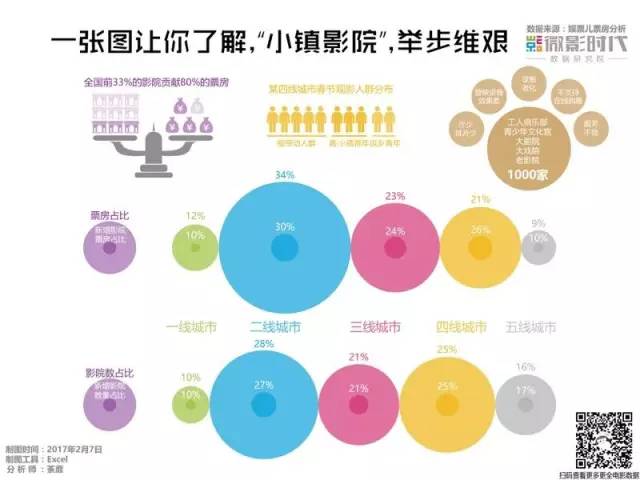 但另一方面现实的情况是,全国33%的影院在去年贡献了80%的票房。一二三线城市的票房占比高过影院数占比,说明常年平均下来经营状况不错。而四五线城市的影院数占比高过票房占比,尤其是五线城市,16%的影院数占比,只产出9%的票房。这说明,四五线城市的影院除了春节期间比较火爆之外,很多时候是比较闲置的,短期内的盈利压力应该不小。