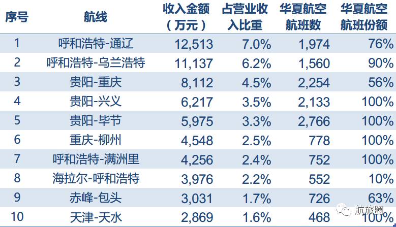 战略定位:目前我国唯一一家长期专注于支线航空运输的独立航空公司,支线航线占比95%,执飞的航班中近 60%飞行时间在 1 小时以内。下图为公司收入排名前十的航线