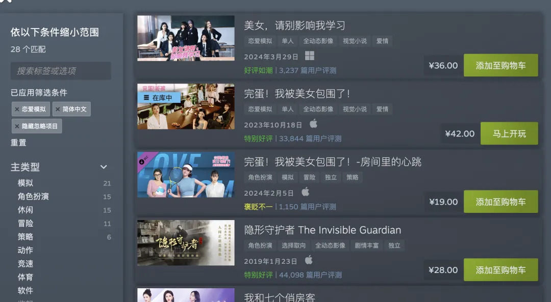 玩家们有的厌烦,“完蛋,我被类《完蛋》/擦边/粪作游戏包围了”;有的刷遍了所有的游戏,庆幸自己一生积善行德,终于可以边玩游戏,边吊嘴角,“谈电子女友,品赛博人生”。