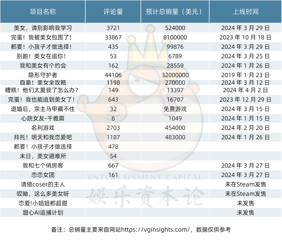 现在,Steam游戏库内标有“全动态影像”tag的游戏,共有417款,其中恋爱模拟类型的共有21款,通过xx网站的分析推算,除了《完蛋》外,都没有破百万美元,多数游戏评论都尚未过千,并不能称之为爆款,其中最少的《退婚后,宗主马甲藏不住》只卖了960份。