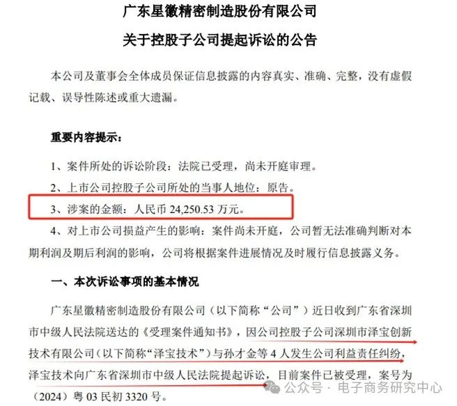4月12日,跨境电商上市公司星徽股份发布公告称,因其100%控股子公司深圳市泽宝创新技术有限公司(以下简称“泽宝技术”)与泽宝技术前高管团伙孙才金等4人存在公司利益责任纠纷,泽宝技术将4人起诉到法庭,目前案件已被法院受理。