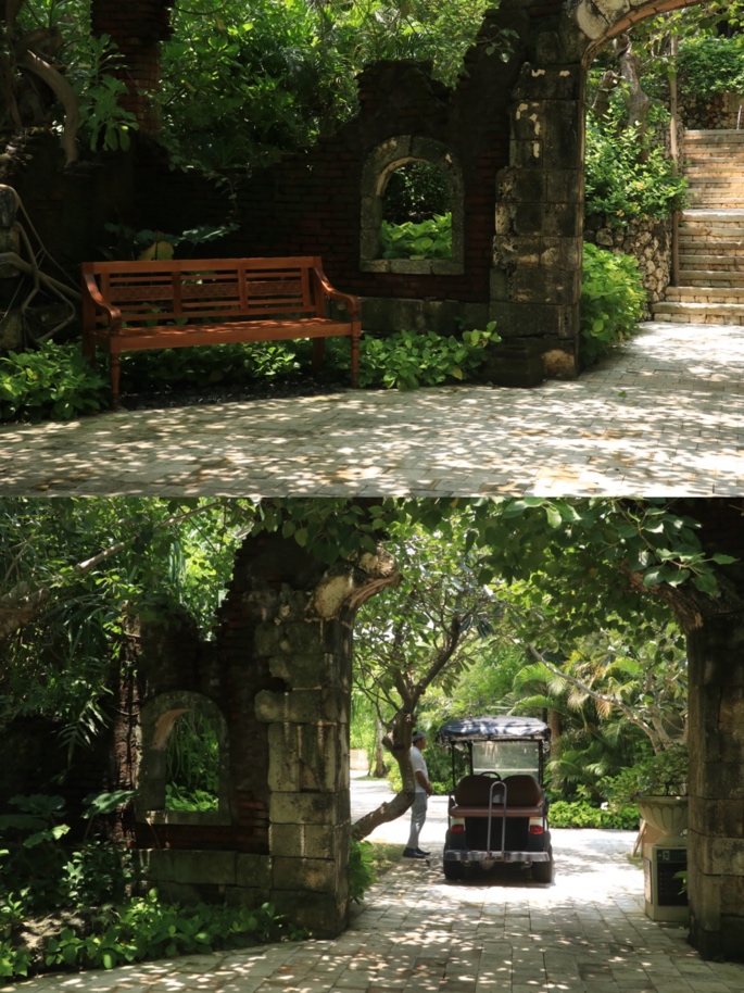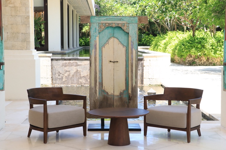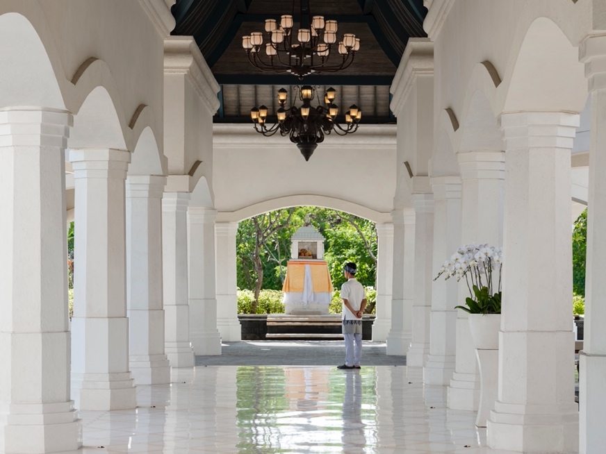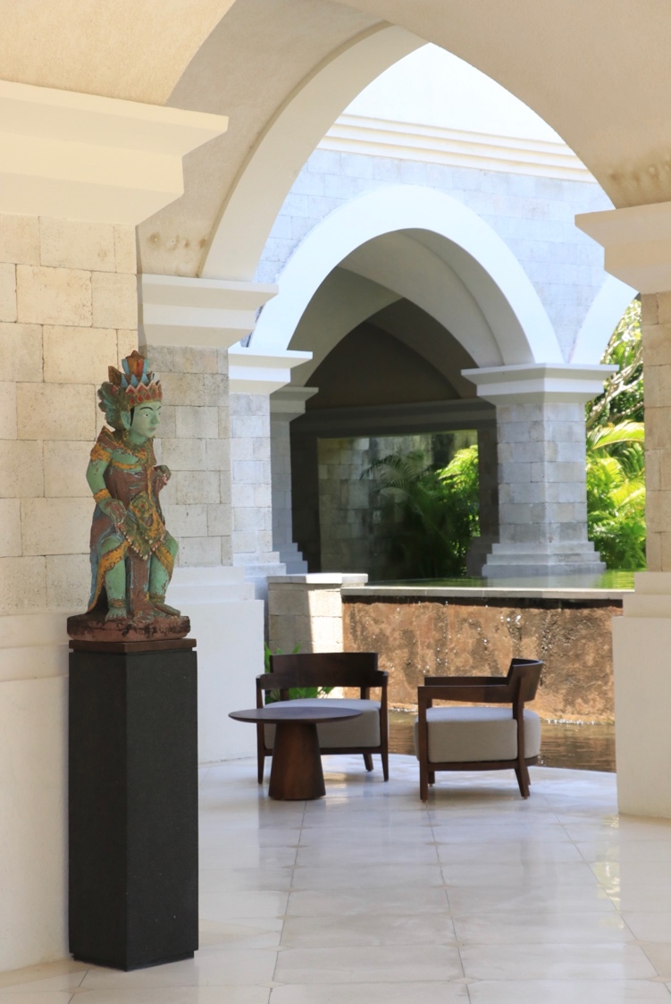 在通往大堂的路上,一棵巨大的佛教圣树菩提迎候人们前来。它的后面是一个迷人的花园。一座阿拉伯风格的庭院里,立着一个 pendopo 式样的爪哇传统圆柱方亭,搭配多处水景,营造出一种宁静的感觉,为远道而来的旅人提供了一个放松休息的环境。脚下一望无际的印度洋景色,令人身心的疲乏消解一空。细巧的墙面雕刻,讲述着古印度罗摩衍那史诗中的故事。加上花型木雕和满者伯夷风格的双开门等诸多精美的细节,创造出一种经典永恒、宁静致远的氛围。
