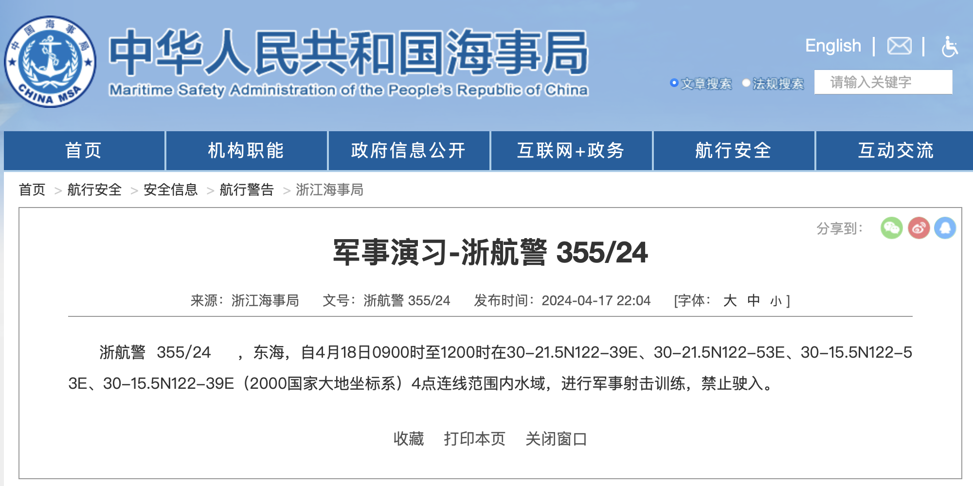 据中国海事局网站消息,浙江海事局发布航行警告,4月18日9时至12时,东海部分水域进行军事射击训练,禁止驶入。