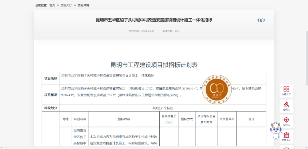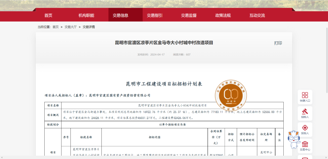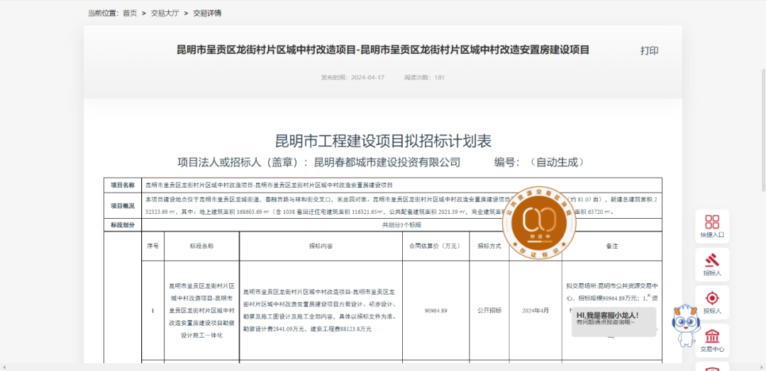 4月17日,云南省公共资源交易信息网发布了3个城改项目的拟招标计划表,分别是“昆明市官渡区凉亭片区金马寺大小村城中村改造项目”“昆明市五华区豹子头村城中村改造安置房项目设计施工一体化招标”以及“昆明市呈贡区龙街村片区城中村改造项目——昆明市呈贡区龙街村片区城中村改造安置房建设项目”。这3个项目合同估算总价达15.57亿元。