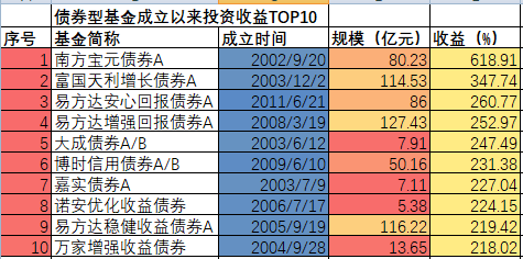 天天基金网数据显示,截止2024年4月15日收盘,两市3400多只债基中,成立以来投资收益前10 的产品,最低也在218%以上(同一只基金A/C只选一个,净值因赎回等原因突然升高者剔除),年化收益率均超过6%。