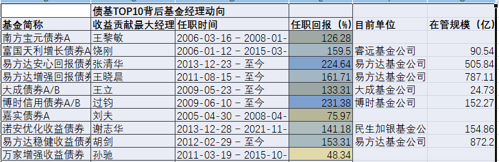 进一步可以发现,TOP10债基里,成立以来收益贡献最大的10位基金经理中,王黎敏、刘夫、孙驰已离开公募行业;饶刚跳槽去了睿远基金公司,目前在管规模90.54亿;谢志华去了民生加银基金公司,在管规模154.86亿。