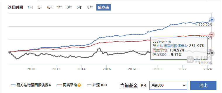 2013年底,张清华开始担任易方达安心回报债券A的基金经理,这是他管理时间最长的一只基金。截止2024年4月15日收盘,这只基金累计收益260.77%,在成立以来收益TOP10 债基中,名列第三。其任期内年化收益13.36%,超过不少权益基金。