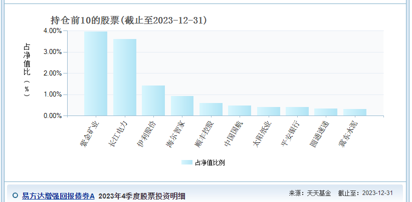 年报显示,截止2023年年底,易方达增强回报债券A股票持仓前10占比12.37%,其中紫金矿业(601889.SH)、长江电力(600900.SH)、伊利股份(600887.SH)分别为3.95%、3.61%、3.42%。