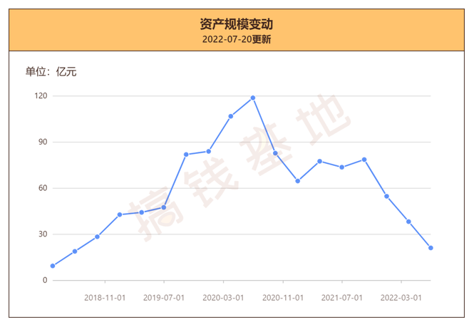 2018年3月-2019年9月,胡剑曾参与管理这只基金,当时它的规模一直在上涨。2020年6月底,最高达到120亿。不过,从那以后,这只基金规模就开始持续缩水。到了2022年二季度,已滑落到21.19亿了。