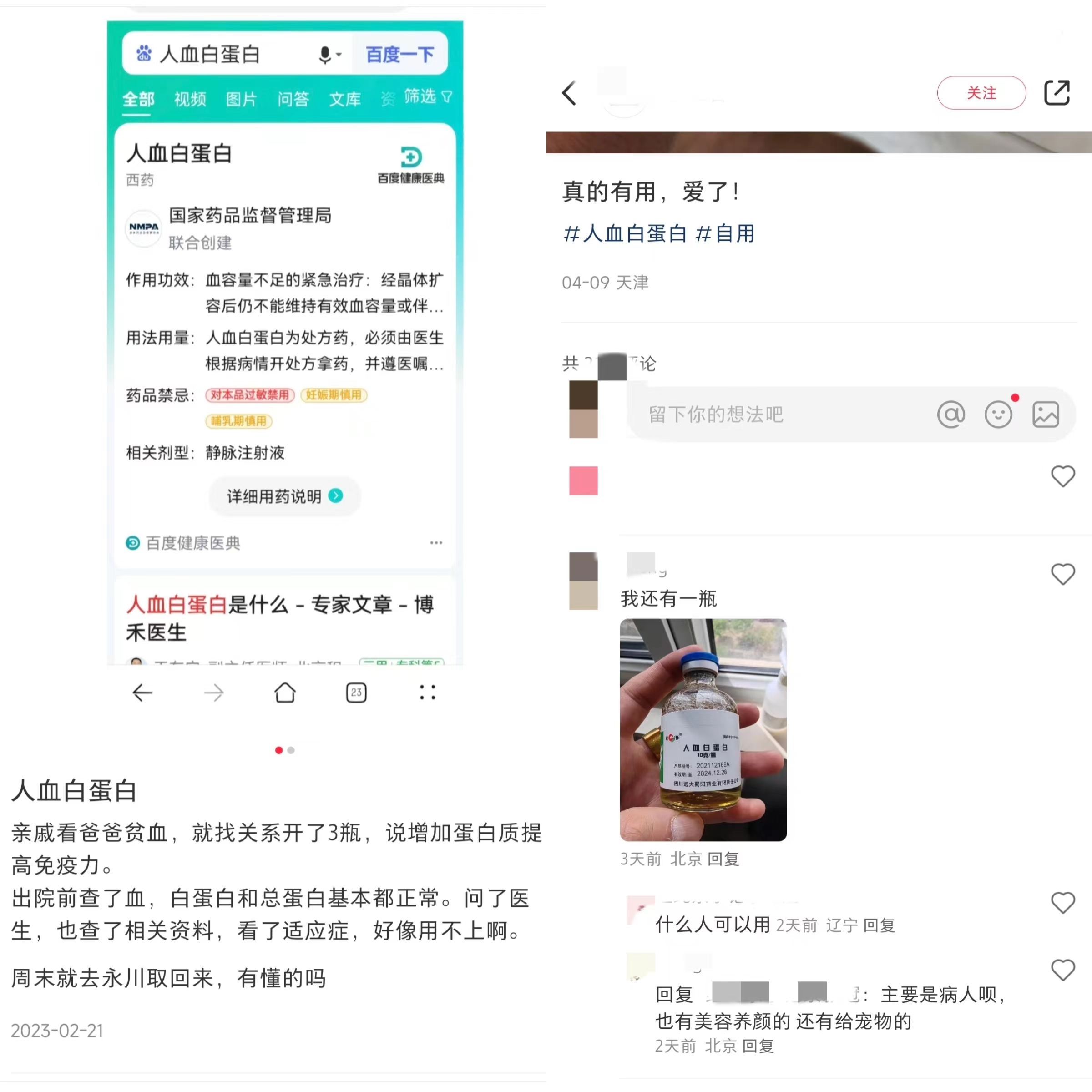 价格的昂贵也未能阻止人血白蛋白的滥用。若在社交平台上搜索“人血白蛋白”可以发现,自费购买该药的人不在少数,甚至有人认为人血白蛋白营养价值高,可以提高免疫力、增强体质、延缓衰老。