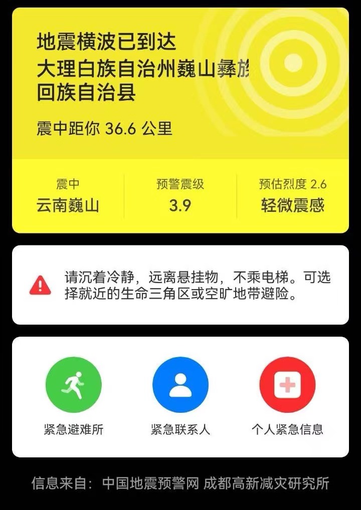 云南省内大理市、普洱市等地网友表示有震感。一位大理网友称,“震感还是比较强的,从睡梦中直接震醒。”省外四川有明显震感;也有安徽网友称早上收到了地震预警,显示距离云南震中1700多公里。