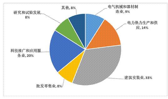 售电公司主要分布在电气机械和器材制造业、电力热力生产和供应、建筑安装业、批发零售业、科技推广和应用服务业、研究和试验发展6大行业,其中分布在“建筑安装业”中最多,占到三分之一,其次为“科技推广和应用服务业”和“电力、热力生产和供应业”,分别占到20%和15%左右,这三个行业占到售电公司行业来源总数的2/3。