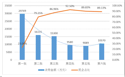 截止发稿日,广东省已公示7批售电公司。分析广东省已通过公示的前6批售电公司,发现民营企业逐渐成为新成立售电公司的主要来源,且注册金额趋势走低。