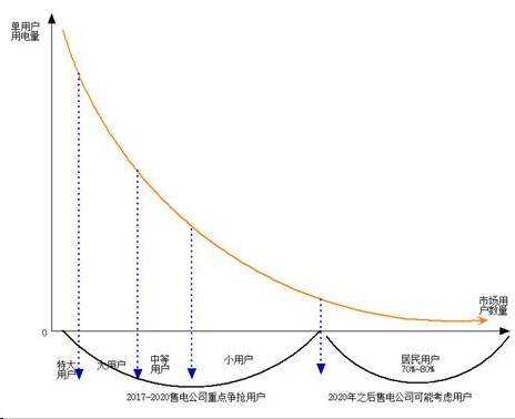 电力市场也基本满足二八规律,即20%的用户消费了近80%的电量,电力特大用户会开展电力直接交易,或者自己成立售电公司,根据广东省2017年长协电量交易结果来看,广东省1746家直购电大用户只有7家电力大用户不选择售电公司代理长协电量,且只占到交易电量总量的3.08%,因此售电公司代理大用户在广东省已经成为主流,如表2。一般大用户和中等用户会让售电公司代理,打捆的形式去市场购买低价电。现阶段用电量较小而且电价较低的普通居民用户不会受到售电公司青睐,如图5。