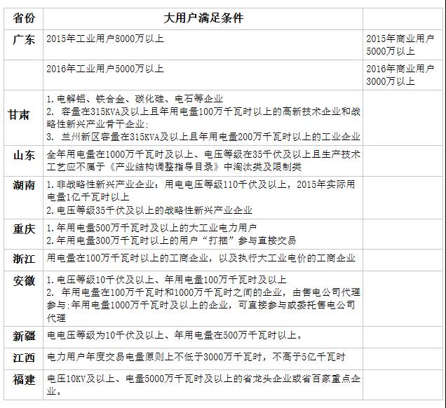 各省对于电力大用户标准各有不同,在“信用良好”、“符合节能环保要求”、“无自备电厂”、“能耗指标先进”等规定之外,最主要的界定标准在于年用电量大小,同时比较近两年来电力大用户标准,发现门槛正逐步降低。