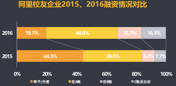 2016年,尽管遭遇资本寒冬,阿里校友还是比一般创业者得到了更多重视。超过7成的阿里校友企业获得融资,B轮及之后的占比达18%。其中最新一轮融资额Top5的滴滴、唱吧、同程旅游、易到、美菜,分别获得了45亿美元、8.74亿美元、60亿元、超7亿美元、20亿人民币投资。而整个创业生态圈拿到的公司占比数不到一半,仅有10%的公司能达到B轮及以后。“相比整体,阿里校友所创立的企业公司发展成熟度遥遥领先,拿融资也更容易。”元璟资本分析师说。