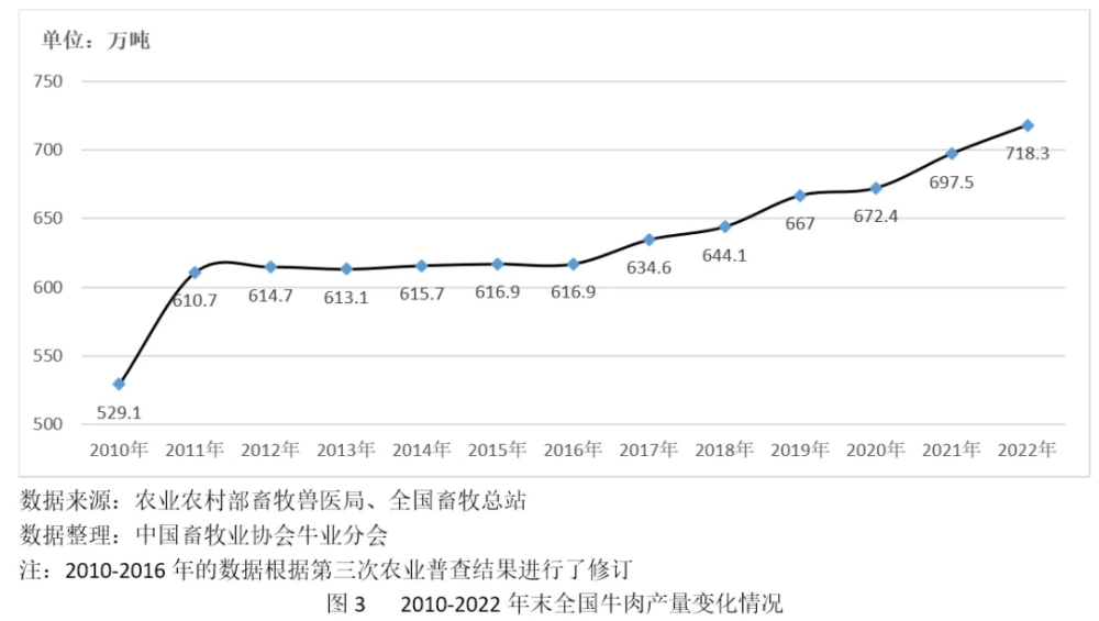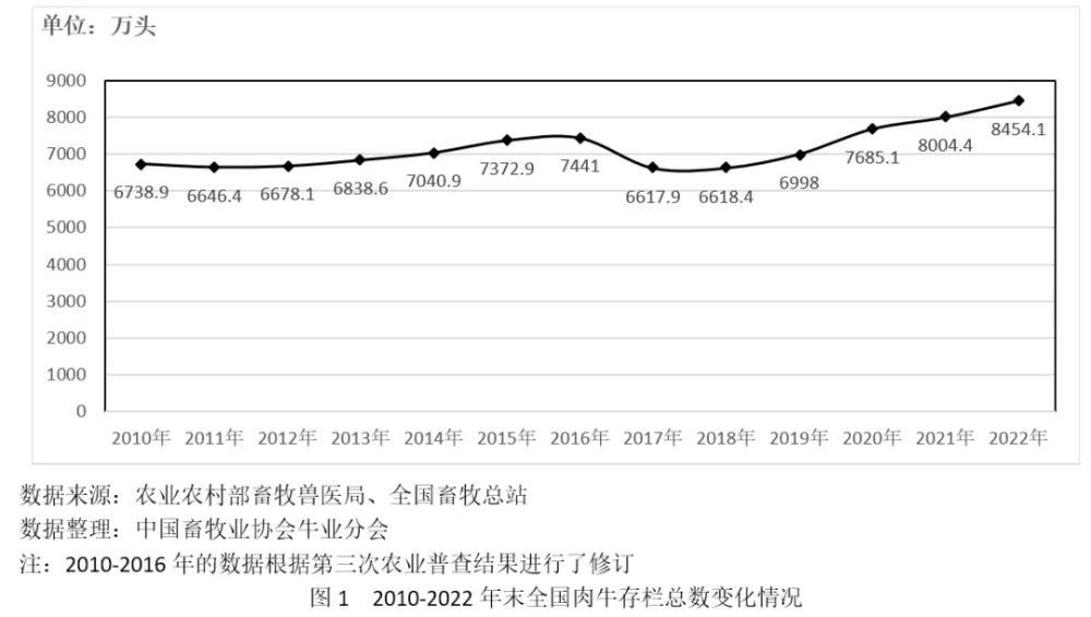 中国畜牧业协会肉牛分会的报告显示,从2010年到2022年,全国肉牛存栏总数从6738.9万头增加到8454.1万头。