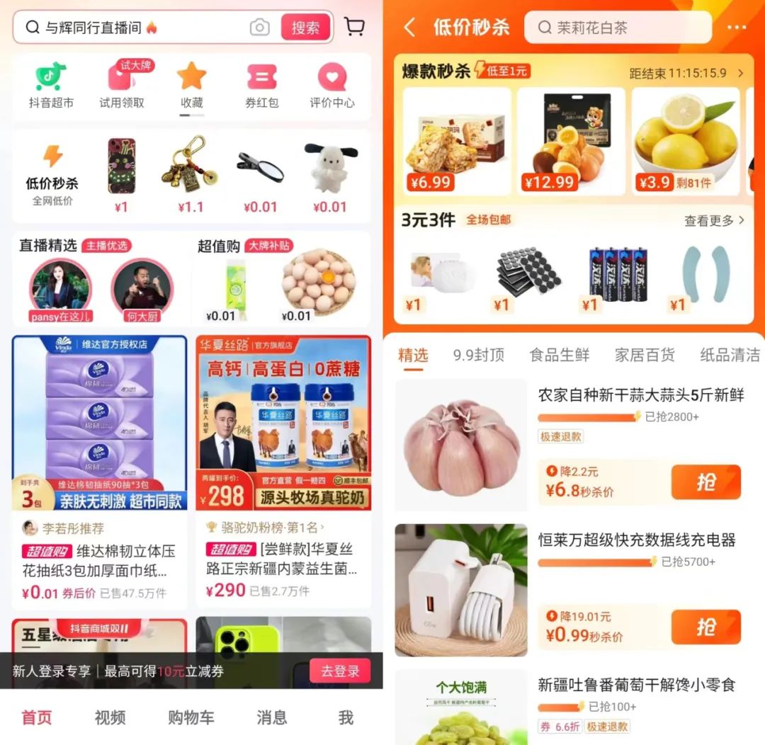 “抖音商城版”独立APP走的是价格撬动流量路线。“低价秒杀”优先级在抖音商城上升,位于页面C位,其中不乏0.01元纸巾、1元手机壳等低价产品。尽管在界面设计、功能上对标传统电商平台,但其目前几乎无法与其他电商平台抗衡。