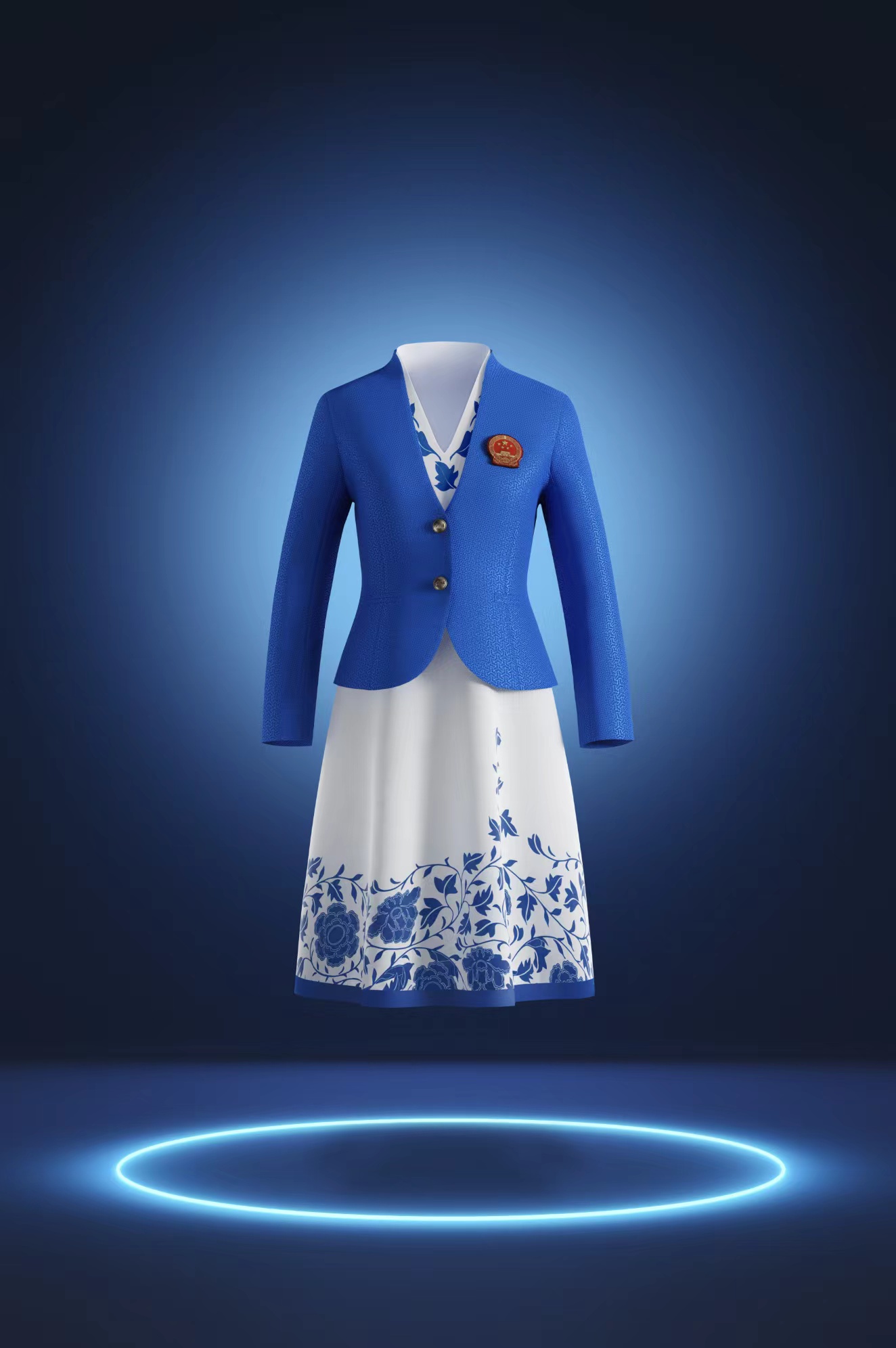 以杭州亚运会的中国代表团开幕式礼服为例,礼服以白色和星辰蓝为主色调,面料采用中华文化特色的锁甲纹,寓意体育的竞技属性以及团结、坚韧的特点;牡丹与藤蔓交织,寓意蓬勃的生命力,颈部的半立领也是中国服饰的传统设计。